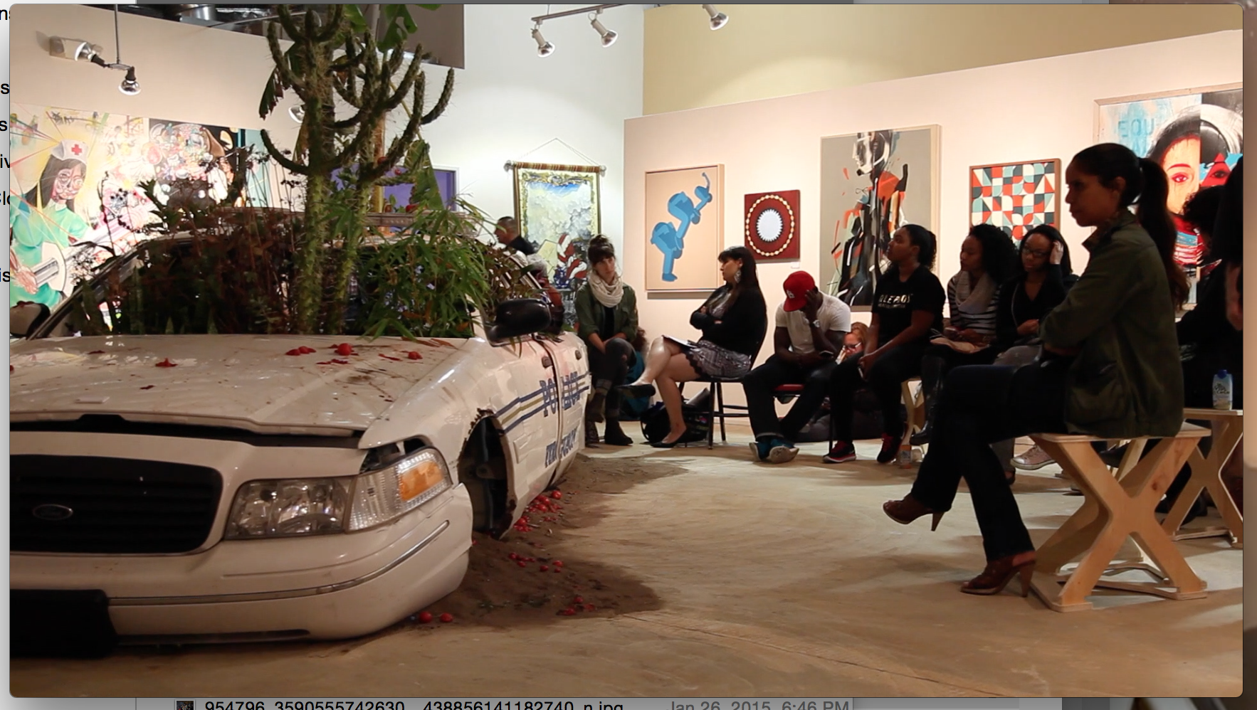 In this LA community of Crenshaw, the line was literally around the block to enter the exhibition. To accommodate the overwhelming reaction of the community the organizers of the event re-routed the audio system to connect with speakers in the downstairs and annex exhibit rooms so that everyone in the building could listen to the panelists speak. In the room next door to the panel discussion it was calmly silent as attendees sat in and around art, listening to Ms. Fulton's voice under the installation art of her son as a hooded angel.